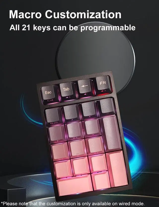Powerful Macro Customization: This external keyboard is not only a numpad, but also a macro pad. All 21 keys can be programmable. You can customize the function and color of each key in the driver. Please note that the customization is only available on wired mode. (Driver download site: