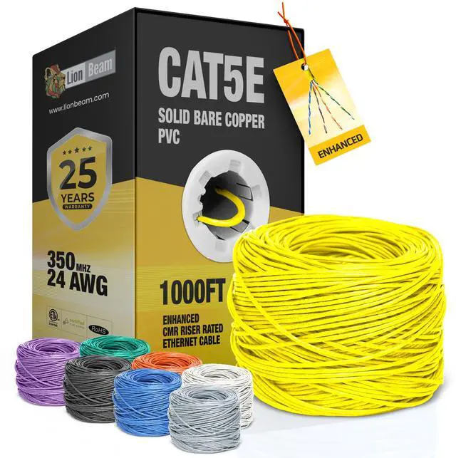 Premium Cat5e Ethernet Cable 1000ft Lion Beam bulk Cat5e ethernet cable comes in a 1000ft (305m) pull box for professional and home installationsdimensions: 305m pre-spooled cable reel with smooth tangle-free pull. With 24 AWG pure copper wires, a 350MHz bandwidth, and speeds of up to 5Gbps, this Cat 5e Ethernet cable delivers fast and stable internet for modems, routers, gaming consoles, CCTV systems, and other network devices.