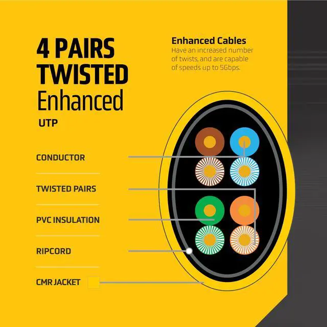 Pure Solid Bare Copper Cat 5 Ethernet Cable This Cat5e ethernet cable bulk spool is manufactured with 4 twisted pairs of pure solid bare copper 24 AWG conductors for superior conductivity and reduced signal loss. Unlike copper-clad aluminium (CCA), these Ethernet wires provide long-lasting durability and maximum performance. The PVC CMR riser-rated jacket makes it a reliable Cat 5 cable for indoor and commercial installations.