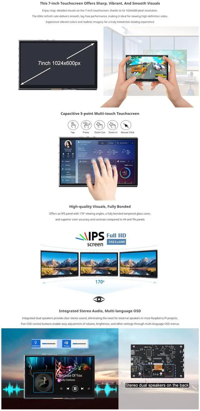 This 7inch capacitive touchscreen display delivers sharp, vibrant visuals with a 1024x600 resolution and 60Hz refresh rate, perfect for programming, DIY projects,