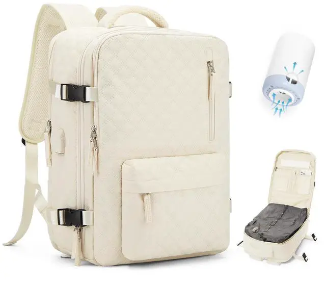 Vacuum Travel Backpack with Pump for Women,Personal Item Carry on Backpacks Flight Approved 18x14x8 inches for Men,Laptop Waterproof Work Compression bags Casual Daypack Beige.