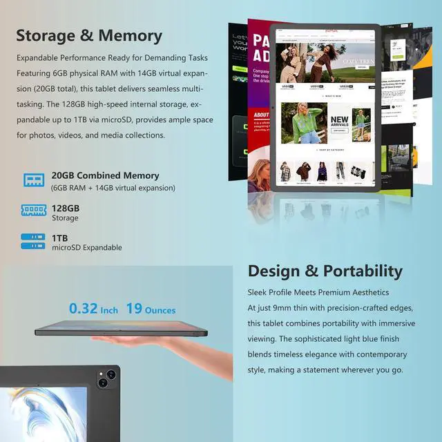 Android 15 Tablet with 128GB ROMExperience next-gen performance with this Android 15 tablet featuring innovative 20GB RAM (6GB physical + 14GB extended) and 128GB storage. Expandable up to 1TB via microSD (cards not included) for all your media files. GMS certified for full Google Play Store access to millions of apps.