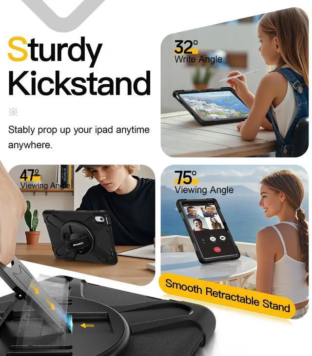 [360°Rotating Handle/Stand & Shoulder Strap]:This ipad 11/10.9 inch case have a 360° rotation system that includes a kickstand and a hand strap, by rotating it, you can hold your ipad at any