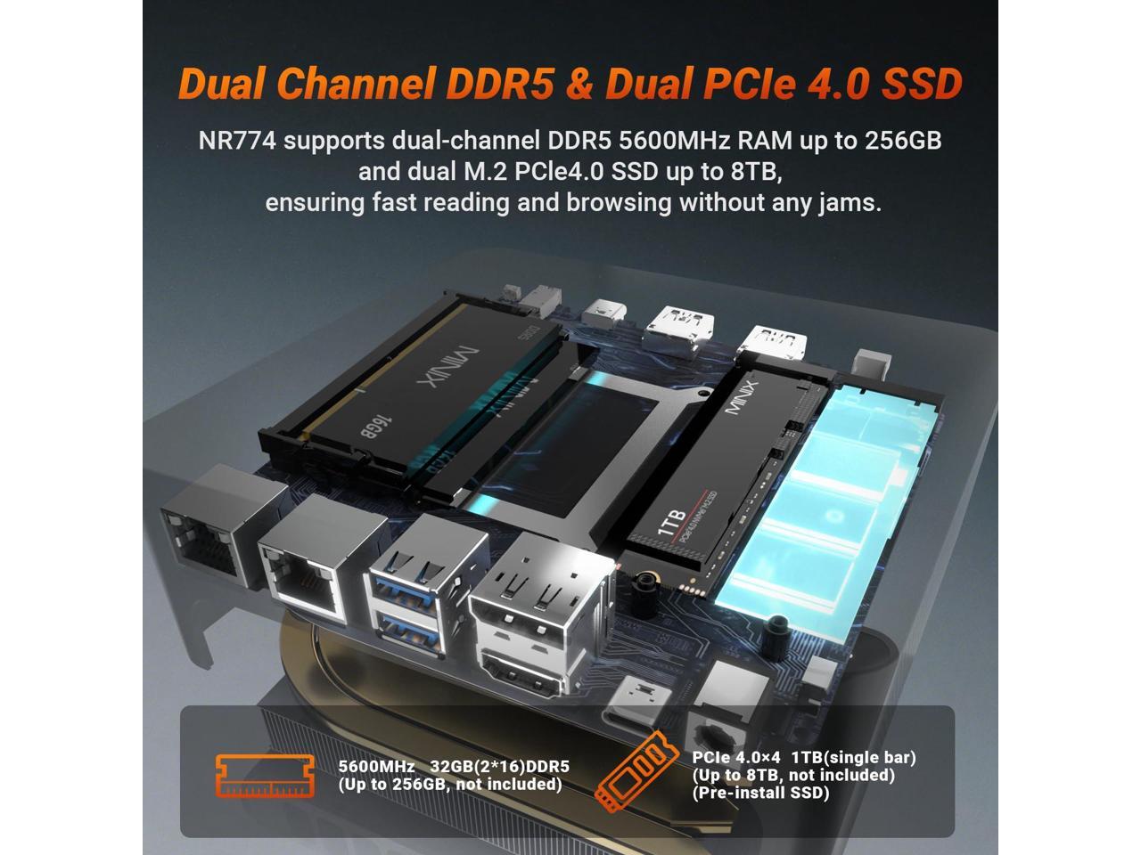 - [Abundant Memory & Storage]Featuring 32GB of fast DDR5 memory (up to 256GB, not included) and a pre-installed 1TB PCIe SSD (up to 8TB, not included), this mini PC provides ample workspace. Opening apps and large files is faster and smoother, and heavy multitasking is a breeze. Store extensive files and games locally, and upgrade storage or memory later to keep your system future-proof and efficient