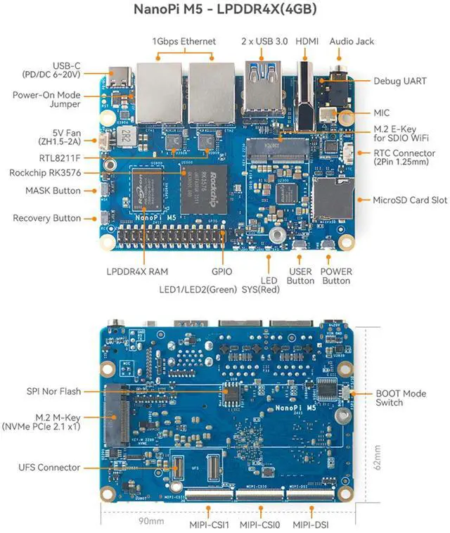 [Greater Storage and Scalability]] NanoPi M5 Portable Wireless Mini Router onboard 4GB LPDDR4X/ 8GB 16GB LPDDR5 RAM. On-Board 16MB SPI Nor flash Supports microSD up to UHS-I Supports UFS 2.0 flash module. Supports M.2 M-Key 2280 NVMe SSD (PCIe 2.1 x1). 2x one Gbps Ethernet ports with RTL8211F PHY chips Supports M.2 SDIO Wi-Fi/BT module. 2x USB 3.2 Gen 1 Type-A ports. 30-Pin 2.54mm GPIO header. 2x 4-Lane MIPI CSI-2 D-PHY v1.2 interfaces.