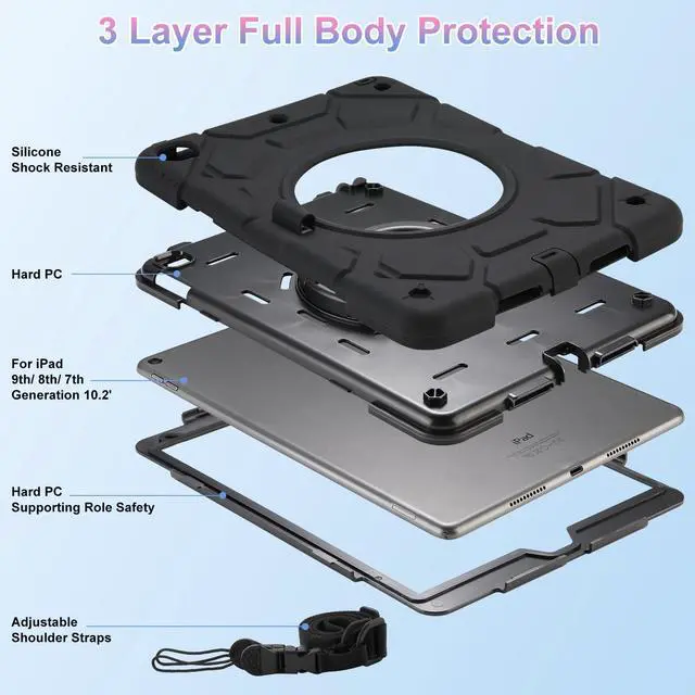 Premium ProtectionThree layer structure design,providing full body protection prevent from drops, shocks, bumps,scratches and dirt.No worry your iPad would slip out of your kids' hands and break. Full access to all ports, buttons and cameras with