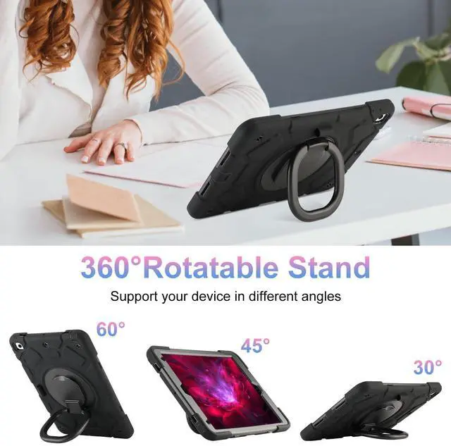 360°Swivel Folding Stand with Pencil Holder360°Rotating Kickstand provides multiple viewing angles, giving you the flexibility and convenience to use your tablet from multiple viewpoints while working, studying or playing on the go,ideal for students, teachers,engineers,cashiers and business people.The iPad 9th Gen/8th Gen/7th Gen case comes with a built-in pencil holder that allows you to easily organize and carry your pencil.