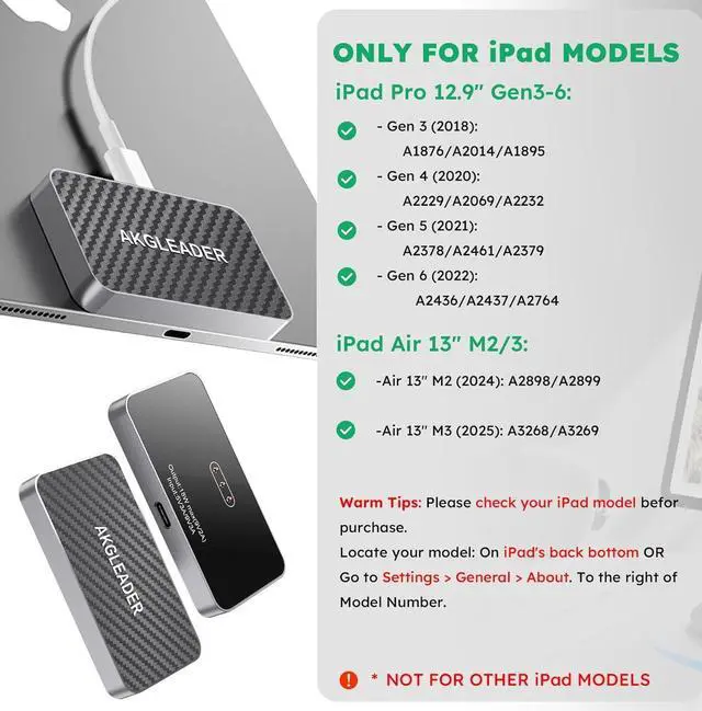 Compatibility: This magnetic charger is exclusively compatible with iPad Air 13in M3 (2025), iPad Air 13in M2 (2024), and iPad Pro 12.9in (3rd/4th/5th/6th Gen). Important notes: 1) Not compatible with other iPad models or Android tablets. 2) Please verify compatibility before ordering to ensure correct model selection for perfect fit and optimal performance. 3) Remove the case during use to ensure the charger maintains full magnetic attachment and optimal charging performance