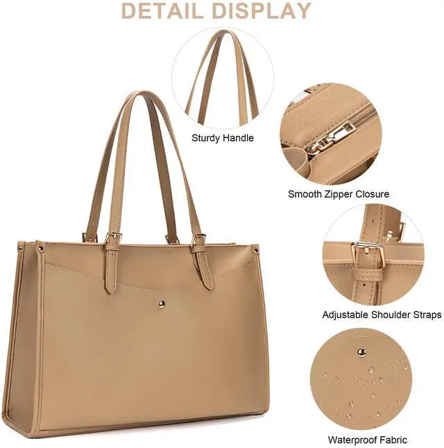 Soft PU Leather A structured tote bag for women crafted from water- and scratch-resistant PU leather, finished with a smooth top zipper and protective metal feet. Holds its shape through daily commutes. Approx. 17" × 5.5" × 12.2".