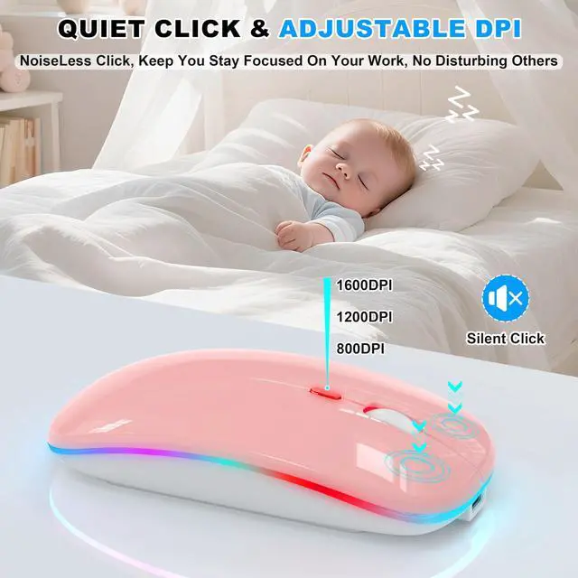 Whether youre in the office or at home, This Bluetooth wireless mouse for a laptop brings style and personality to your setup ^^ Precise Tracking with 3-Level Adjustable DPI FYBC Bluetooth wireless mouse for MacBook Air utilizes a high-performance optical sensor that delivers ultra-smooth, responsive tracking across most surfaces. Whether you're working from a coffee shop or your home office, enjoy pinpoint accuracy and effortless control. A quick press of the DPI button (1second) cycles between (800/1200/1600DPI), giving you the freedom to change the speed and sensitivity of your laptop wireless mouse cursor - it is the best apple magic mouse alternative for daily tasks ^^ LED Mouse & Mouse Mover 2-in-1 FYBC 2025 upgraded light up wireless mouse combines a cordless mouse and jiggler with two! No need for an extra jiggler mouse mover simply press and hold the DPI button for 3-5 seconds to activate the undetectable jiggler mode to keep your computer from locking when you have to step away is perfect for office workers, remote workers, IT professionals and more ^^ Silent Clicks & Comfort Enjoy up to 90% less clicking noise so you can work or study in peace without disturbing others.