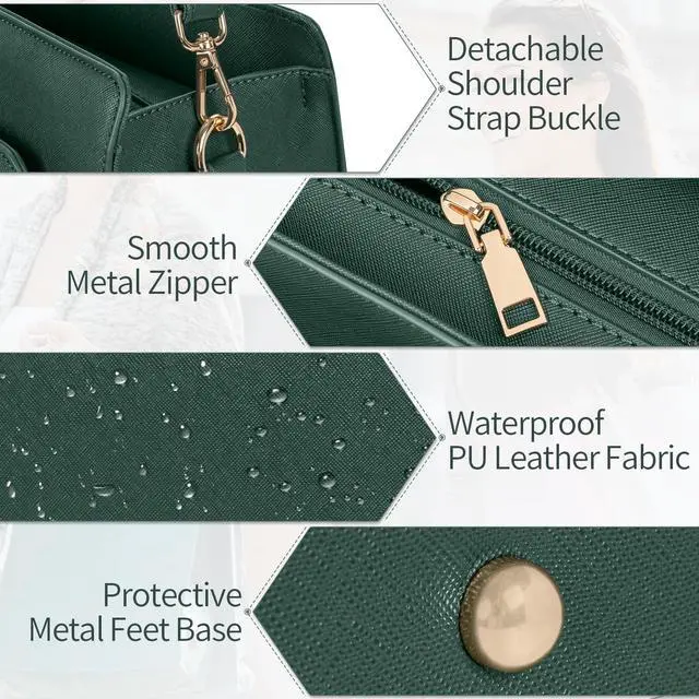 The main compartment features a thick padded sleeve with anti-collision foam and a secure velcro strap at the top to keep your device in place, providing all-around protection during commutes or travel. Perfectly sized to carry your laptop, tablet, and all daily essentials with ease and style ^^ PREMIUM MATERIAL & WATERPROOFThe briefcase for women is crafted from premium soft PU leather, the waterproof PU leather material protects the device from spills and makes cleaning easy and convenient. The sturdy gold hardware makes the PU bag more stylish and durable; the smooth top zipper closure design ensures that your belongings are safe and secure; the bag is also equipped with metal foot pads at the bottom to protect your briefcase from scratches ^^ REMOVABLE & ADJUSTABLE SHOULDER STRAPReinforced Adjustable Straps design offers two carry ways, can be used as a tote or a shoulder bag.