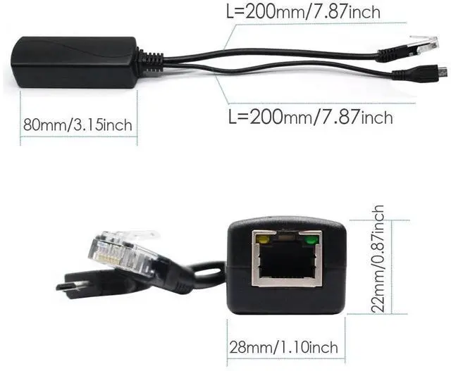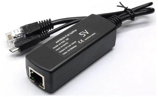 The Active PoE Splitter splits a PoE signal into an 5VDC power and 10/100Mbps ethernet data source. This device allows you to run ethernet cables from a POE Switch over long distance, and then split the PoE signal into a separate data signal and 5Vdc power sources in order to run an non-PoE devices.