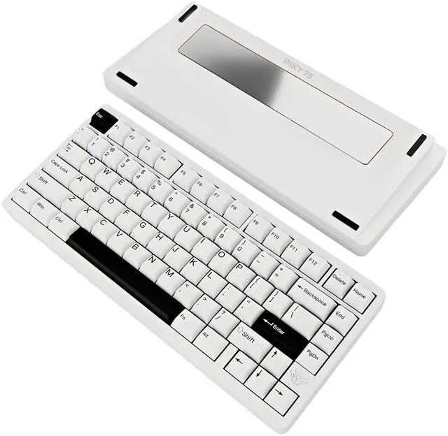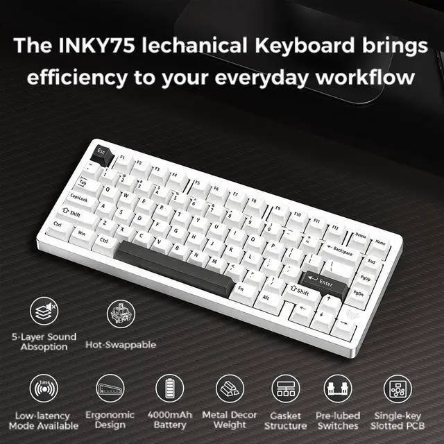 Full Aluminum Chasis KeyboardThe Inky 75 is a high-quality 75% mechanical keyboard with a full aluminum chasis, enhanced by a glitter finish. This design not only adds a modern and elegant touch, but also ensures solid build quality that withstands daily wear and tear. Its a perfect fit for gamers, professionals, and mechanical keyboard enthusiasts looking for durability and style in one package. ^^ Satisfying Sound with Five Layers of Dampening Designed with sound in mind, the Inky 75 includes five layers of acoustic padding: PORON plate foam, IXPE switch pad, PET acoustic film, EPDM case foam, and PET insulation film. These layers work together to reduce hollowness and deliver a smooth, creamy sound signature with every keystroke. Whether you're streaming, gaming, or working, this keyboard offers a refined typing experience that feels focused and satisfying. ^^ VIA-Compatible & South-Facing RGB LightingThe Inky 75 compatible with VIA web driver, giving users full control to program and remap keys, adjust lighting effects, and create macros. Paired with south-facing RGB LEDs, the keyboard ensures optimal backlight visibility. With multiple color options and customizable modes, it's perfect for users who enjoy personalized lighting setups. ^^ Triple Mode Connection & Long Battery LifeEquipped with three connection modesBluetooth, 2.4GH z wireless, and USB-C wiredthe Inky 75 offers seamless device switching and flexibility. Its built-in 4000mAh battery provides up to a week of wireless use on a single charge with backlight off, making it great for both office and gaming setups. Switching between devices has never been this convenient. ^^ Hot-Swappable PCB & Premium Stock SwitchesThe Inky 75 features a hot-swappable PCB that supports both 3-pin and 5-pin mechanical switches, allowing users to easily swap switches without soldering.