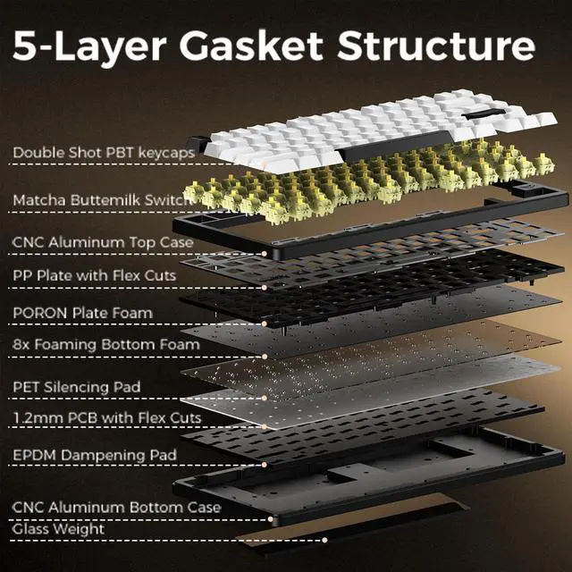 It comes pre-installed with smooth, factory-lubed Matcha Buttermilk linear switches, developed in collaboration with HMX. Combined with durable OEM profile PBT keycaps, this keyboard delivers a buttery-smooth and consistent typing feel right out of the box.