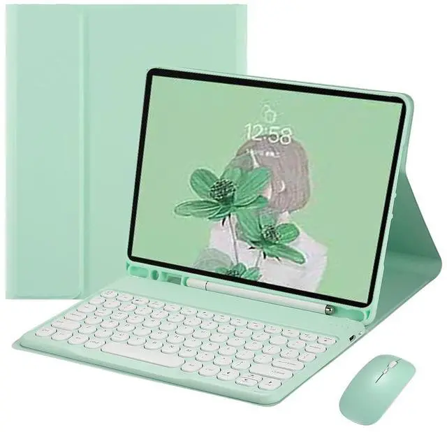 iPad Keyboard Case Retro Round Key with Mouse Cute Color Keyboard Detachable Keyboard Slim Leather Folio Smart Cover with Pencil Holder