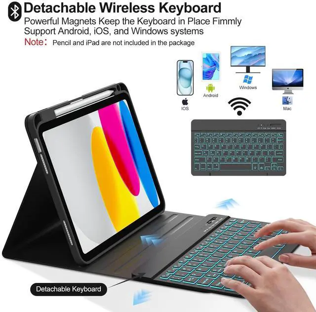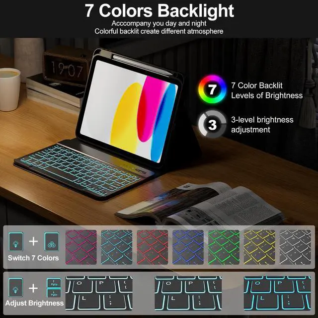 Note: Pencil and iPad not included) ^^ Multiple Viewing Angles AdjustThis for 10th gen iPad case with keyboard has 3 anti-slip grooves design to adjust the viewing angle as you like, make your tablet stand steadily. You can adjust the screen angle this way for studying, working, painting or watching videos, do more computerig, suitable for home, office or school use ^^ 7 Color Backlight, Multi-function KeysThe backlit keyboard has 7 colors, 3 adjustable brightness levels. You can switch between backlit mode and breathing light mode, making typing more fun and easier in dark environments. The backlight mode can be turned off. The entire row of shortcut keys can quickly adjust volume, brightness, switch input methods, and return to the homepage, greatly improved your productivity ^^ Built-in Pencil HolderThis keyboard case for iPad 11/ 10.9 inch 2025 A16/2022 built-in Right Side Pencil Holder and pen slot for easy storage, preventing your Pencil from being lost. The cutout in the back makes it easy to take the stylus out for use.