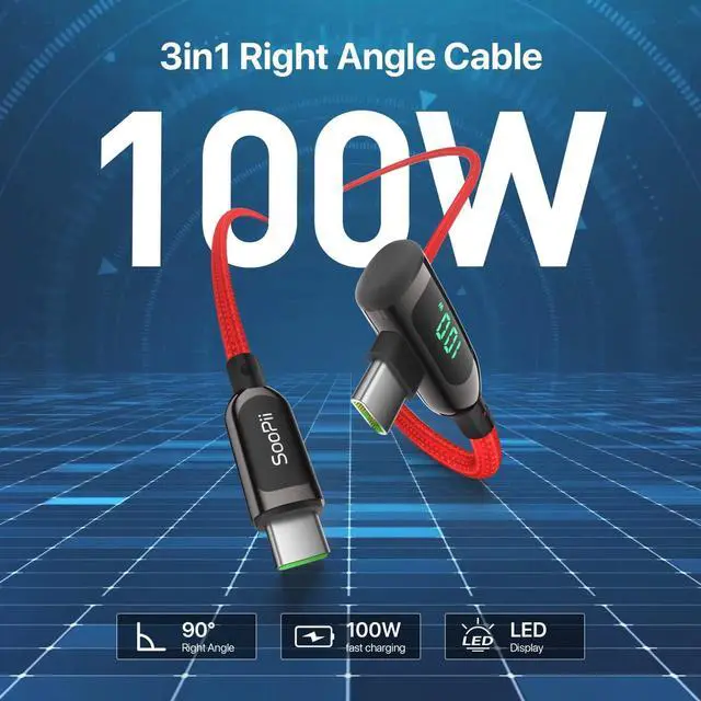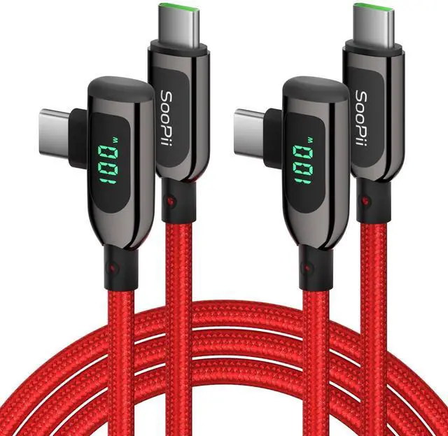 User-friendly Right Angle CableWith considerate 90 degrees right angle design, easy to play games, watch videos and read e-Books while charging comfortably. ^^ Smart LED DisplayReal-time charging power visible, show charging status and signify high power process. Built-in smart chips monitoring the charging power and adjusting current and voltage automatically, avoiding damage to the battery in case of unstable current. (Please note display module just show charging power, it neither increase nor decrease charging current. ) ^^ 100W High-Speed ChargingSupports up to 100W (20V 5A) charging speed, with a max output of 100W charger, SooPii USB C to USB C cable can charge any Type-C devices from phones to laptops.