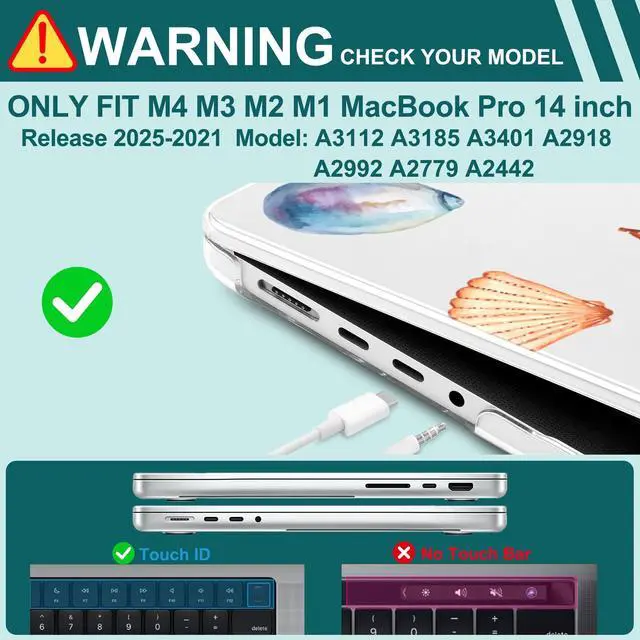 Compatible With - Only for MacBook Pro 14 Inch 2025 2024 2023 2022 2021 (Only compatible model: A3434/A3112/A3401/A3185/A2918/A2992/A2779/A2442). Please confirm the model on the bottom of the MacBook before ordering ^^ Durable Material -case for MacBook Pro 14" M5 M4/M3/M2/M1 is made of hard PC material, effective anti-slip/shockproof/anti-scratch etc ^^ Case Design - The case adopts the top and bottom case separation design, easy to install and remove ^^ Case Port Design - Precise cutouts allow full access to all ports, features, buttons, and Touch ID functionality ^^ Package - Included 1 case for MacBook Pro 14 inch, 1 Keyboard Cover, 1 Trackpad Protector, 2 OTG Adapter