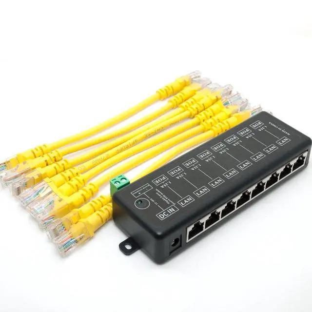 Included: 8 Ports Gigabit Passive PoE injector x12pin power input port terminal block x115cm 568B CAT5E Ethernet RJ45 Patch Cable x8 (Power supply not included) This item do not include the power adapter, you need to buy an extra power adapter according to your requirement. Please use DC48V-55V power supply for 802.3 af / 802.3 at PoE device, DC24V power supply for 24V PoE device.