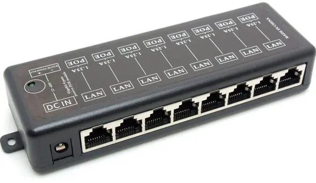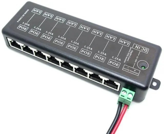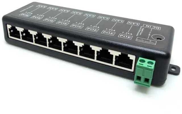 Features: Compatible with 10/100/1000Mbps fast ethernetUse with any ethernet switchIdeal for PoE IP Cameras, VOIP, AP8 Port Injector(8 Lan&8 Lan+PoE port)Midspan Mode-B Unsolicited Power(4, 5+/7, 8-)Additional terminal block power input portPer port