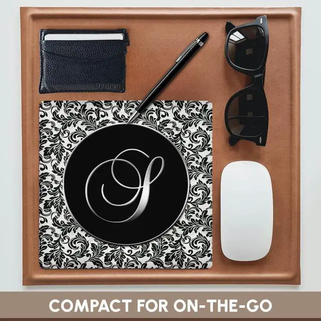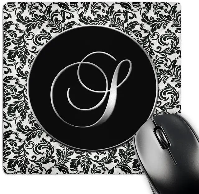 Letter S - Black and White Damask Mouse Pad is 8" x 8" x. 25" and is made of heavy-duty recycled rubber. Matte finish image will not fade or peel. Machine washable using a mild detergent and air dry.