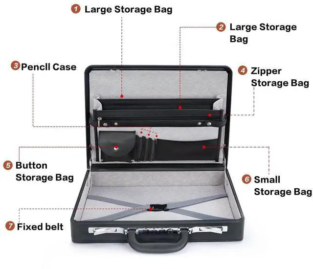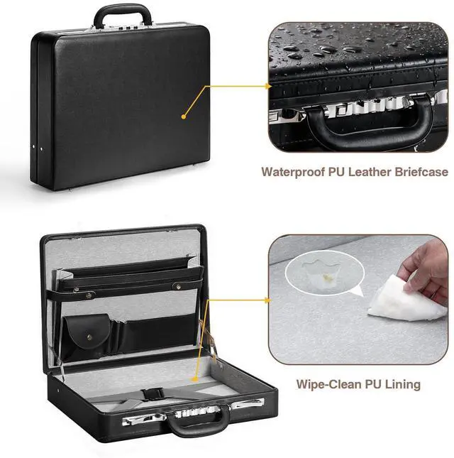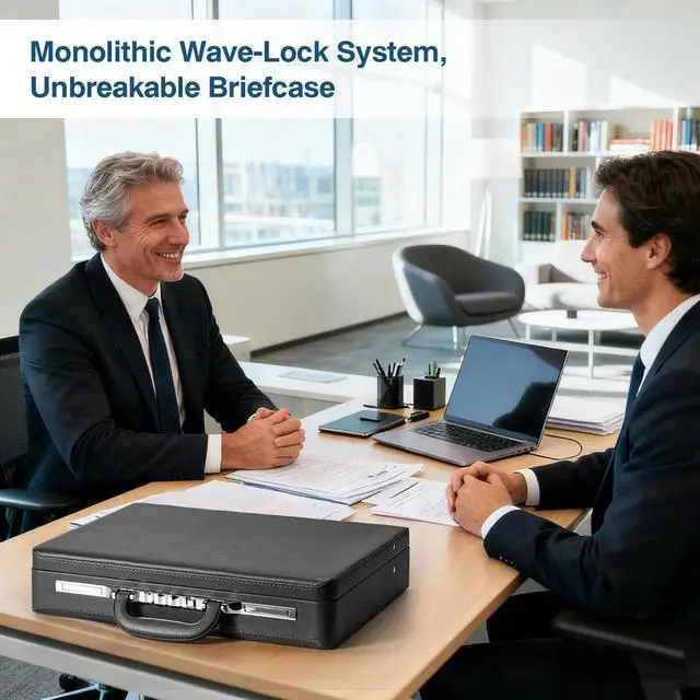 Spacious & Organized Storage Stay organized on the go! This lockable briefcase includes six compartments: a laptop pocket, zippered storage, pen bag, and dedicated spaces for phone and documents, making it perfect for professionals ^^ Secure Wave Combination Lock Designed with enhanced security, this storage lock box features dual combination locks to keep your important items safe from unauthorized access, ensuring peace of mind during travel or office use ^^ Sleek & Durable PU Leather The LOCKCURX men's briefcase is made with premium PU leather, offering a sophisticated vintage design in black. Its durable, hard exterior provides a polished look and long-lasting protection for your business essentials ^^ Ideal for Business, Travel & Gifting This versatile locking trunk keeps your essentials secure and organized, whether you're commuting, traveling, or attending meetings. Its sleek design makes it a perfect gift for professionals ^^ Ideal for Business, Travel & Gifting This versatile locking trunk keeps your essentials secure and organized, whether you're commuting, traveling, or attending meetings. Its sleek design makes it a perfect gift for professionals