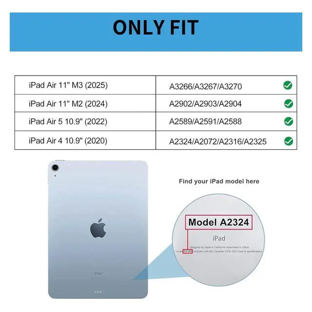 CompatibilityThe case is designed for iPad air 7th 2025 (A3266/A3267/A3270) / air 6th generation 2024 (A2902A2903A2904) and iPad air 5th 2022 (A2588A2589A2591) / iPad air 4th 2020 (A2316A2324A2325A2072) . It is not compatible with any other device. Please check the back bottom of your iPad to find the model number.