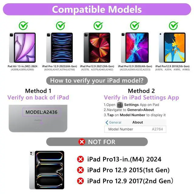 CompatibilityThe keyboard case is perfectly compatible with the latest iPad air 13 inch (M2) 2024 (A2898, A2899, A2900), For iPad Pro 12.9 inch 6th Generation 2022 (A2436, A2764, A2437, A2766), For iPad Pro 12.9 inch 5th Generation 2021 (A2378, A2461, A2379, A2462), For iPad Pro 12.9 inch 4th Generation 2020 (A2229, A2069, A2232, A2233), For iPad Pro 12.9 inch 3rd Generation 2018 (A1876, A2014, A1895, A1983).