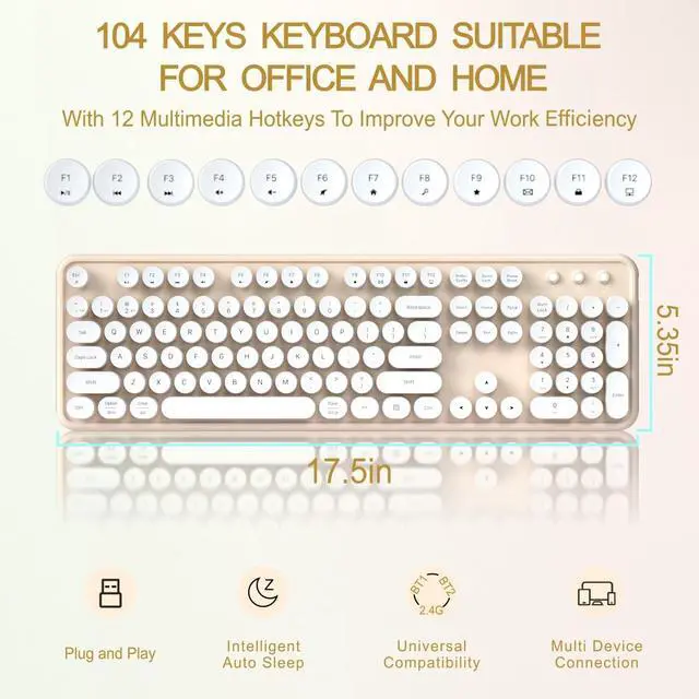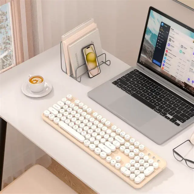 Wide Compatibility: Featuring 104 keys, including function keys and a numeric keypad, our bluetooth keyboard is perfectly sized for efficient typing. It's compatible with a range of devices including iPad, iPhone, iMac, MacBook, Laptop, PC, Tablet, Smartphone, Windows, iOS, Mac OS, and Android. Whether you need a computer keyboard, keyboard for iPad, or a cute wireless keyboard, this device fits all needs. It's the ultimate retro keyboard or creamy keyboard with number pad for any setup ^^