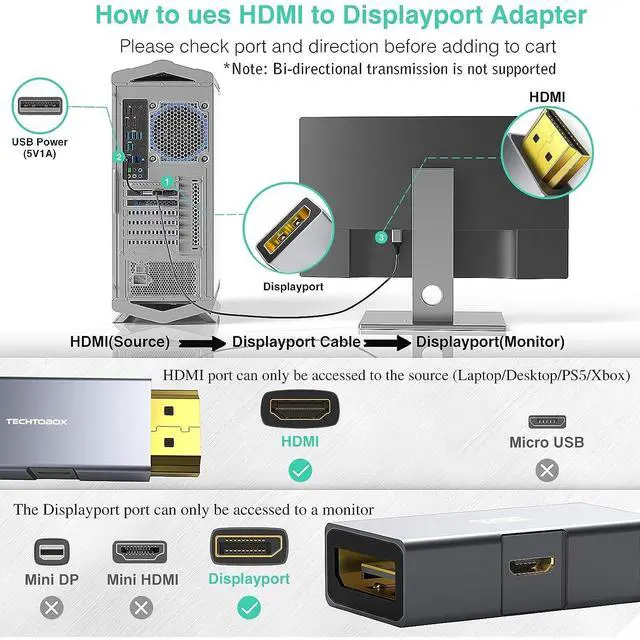 Please note: this is one-way. Only from HDMI source device to DP display device is supported. Be sure to connect the Micro power supply connector for proper use. Please do not use with any KVM/Hub/Docking! ^^ Compact and