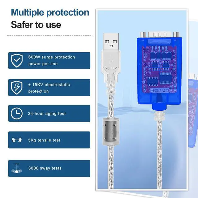 The attached terminal block allows for easy plug-and-play setup, and the filtering magnetic ring reduces interference for more stable transmission. ^^ High-Speed and Long-Distance Transmission Supports data transmission speeds above 1Mbps and ensures a transmission distance of up to 1200 meters at 9600bps on the RS-485/422 end, with a USB end distance not exceeding 5 meters. The converter features a standard USB 2.0 and DB9 pin transmission interface, working asynchronously in point-to-point or multi-point modes. ^^ Broad System Support and Robust Environment Adaptability Compatible with multiple operating systems, including Win98/2000/2003/2008/XP/Vista/Win7 (32/64 bit)/8/CE/Mac/Linux, this converter operates reliably in extreme environments with an operating temperature range of -40C to 85C and relative humidity between 5% and 95%.