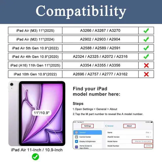 CompatibilityExclusively designed for iPad Air 11 inch 2025/2024 & iPad Air 5th/4th Generation 10.9 -inch ONLY. iPad Air 11-Inch 2025