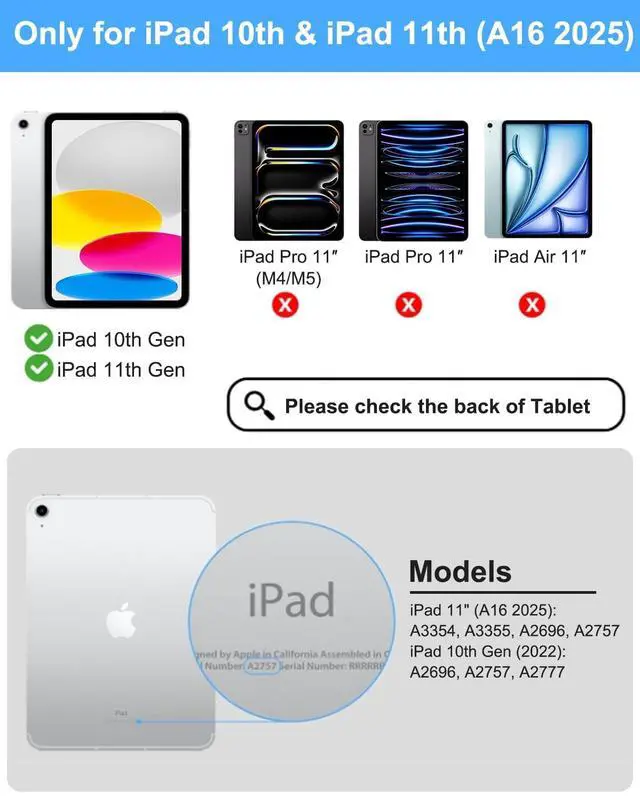 ^^ Compatibility: This keyboard case is only compatible with iPad 10th Generation (models A2696, A2757, A2777) and iPad 11th A16 2025 (models A3354, A3355, A3356).