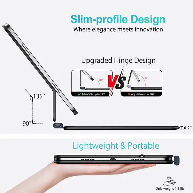 ^^ Floating Cantilever Design: This magic keyboard features an upgraded hinge design, enabling smooth adjustment of viewing angles up to 135 for enhanced ergonomic comfort.