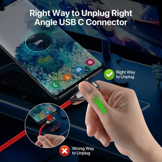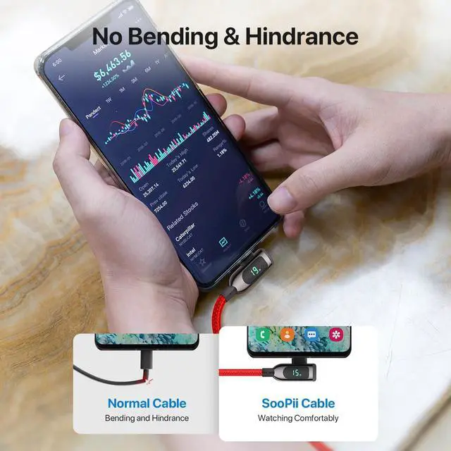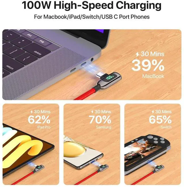User-friendly Right Angle CableWith considerate 90 degrees right angle design, easy to play games, watch videos and read e-Books while charging comfortably. ^^ Smart LED DisplayReal-time charging power visible, show charging status and signify high power process. Built-in smart chips monitoring the charging power and adjusting current and voltage automatically, avoiding damage to the battery in case of unstable current. (Please note display module just show charging power, it neither increase nor decrease charging current. ) ^^ 100W High-Speed ChargingSupports up to 100W (20V 5A) charging speed, with a max output of 100W charger, SooPii USB C to USB C cable can charge any Type-C devices from phones to laptops.