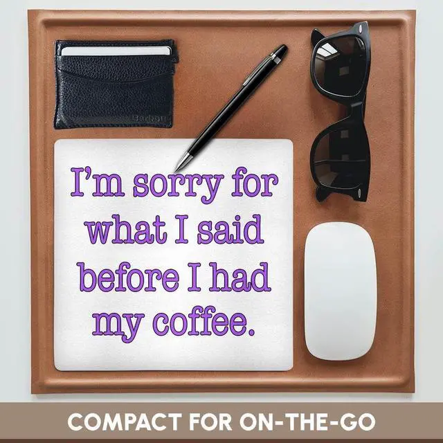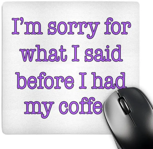 I'm sorry for what I said before I had my coffee. Purple. Coffee Lover. Mouse Pad is 8" x 8" x. 25" and is made of heavy-duty recycled rubber. Matte finish image will not fade or peel. Machine washable using a mild detergent and air dry.
