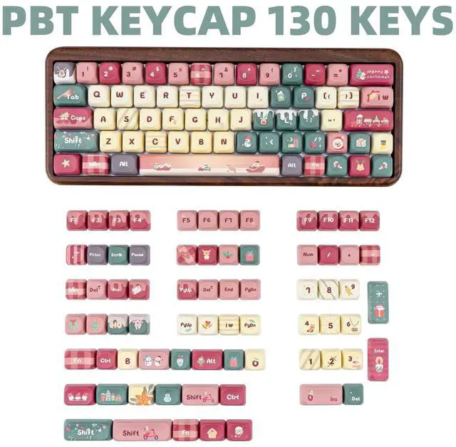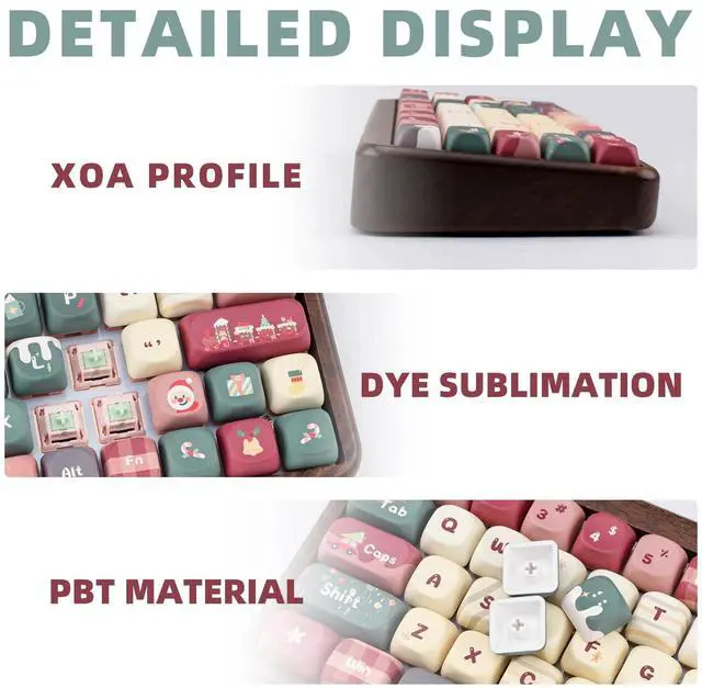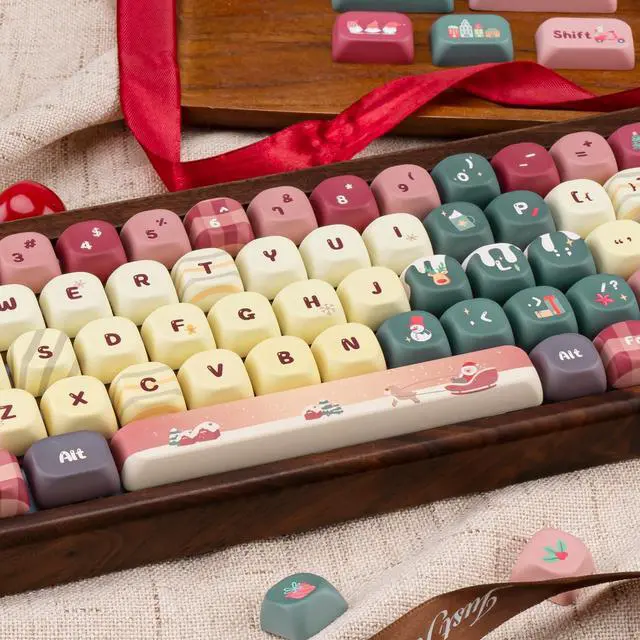 PBT material keycapsCute keycaps are made of matte textured, grease-resistant coated PBT material, which is resistant to abrasion, high temperature and solvents. Comfortable hand feeling for long time use ^^ Dye sublimation Technology KeycapsThe Christmas style pattern on Coomickey keycaps is made by dye sublimation process, which makes the lovely pattern more stable, complete and won't fade ^^