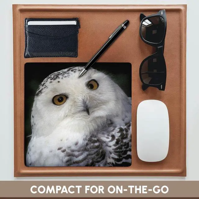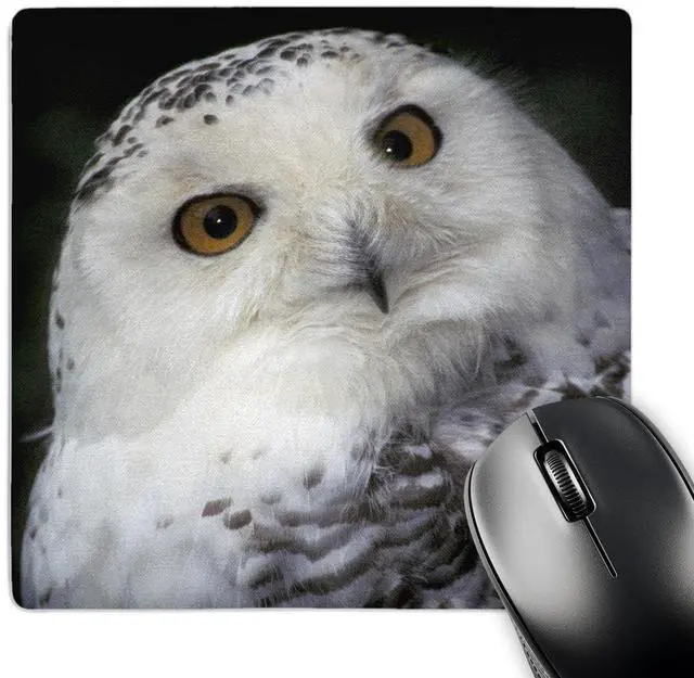 Snowy Owl - NA02 MWE0133 - Michele Westmorland Mouse Pad is 8" x 8" x. 25" and is made of heavy-duty recycled rubber. Matte finish image will not fade or peel. Machine washable using a mild detergent and air dry.