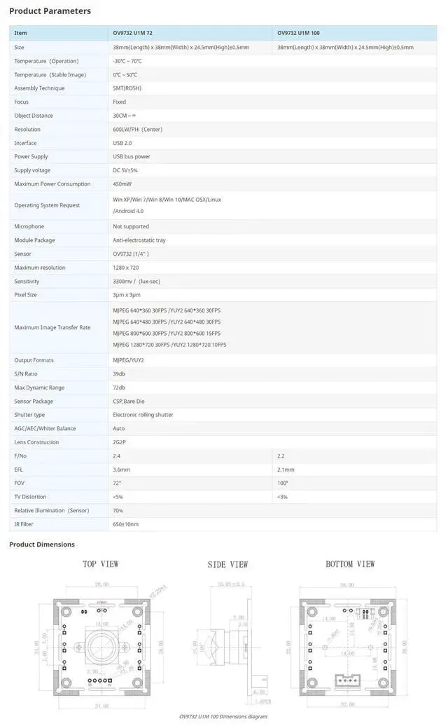 OverviewThis camera features the OmniVision Technologies' CMOS image sensor OV9284, capable of providing 1 megapixel HD images with a maximumresolution of 1280*720. It connects via a USB 2.0 interface, weighs only 25 grams, supports manual focus adjustment, and compatible with operatingsystems such as Win XP/Win7/Win8/Win10/MAC OSX/Linux/Android. Packing List1. OV9732 U1M 100 x12. USB Male-to-Male Cable x1