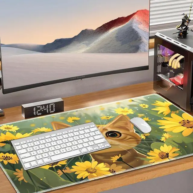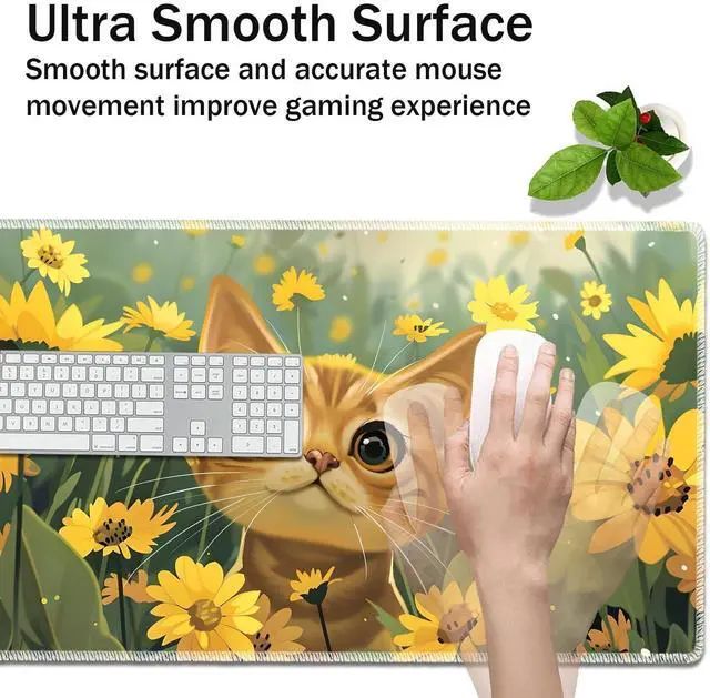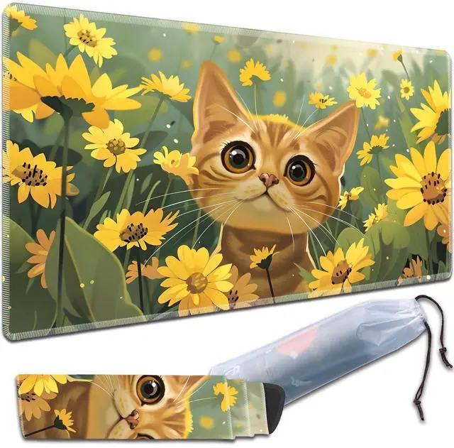 VSOJSOJKE MTG Play Mat, 24" x 14" TCG Card Play Mat, Surface with Smooth Stitched Edge, Kitten and Yellow Flower