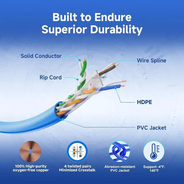 With a 25-year warranty, you can trust in our long-term reliability. ^^ Convenient Length MarkersCat 6 cable feature length markers every 2 feet, starting from the 1000-foot length and decreasing with usage. This makes measuring and managing cable lengths easy, ensuring everyone always have enough cable for their installations without any guesswork. ^^ Tangle-Free DesignCat 6 Ethernet cables come with a specially designed box featuring a wide exit hole, allowing for easy cable retrieval without tangling. Say goodbye to wasted time on kinks and twists with our tangle-free design. ^^ Free Cat6 RJ45 ConnectorsEach purchase bundle with 20pcs Cat6 50 micron gold-plated RJ45 connectors with 20pcs strain relief boots, adding extra value to your investment.