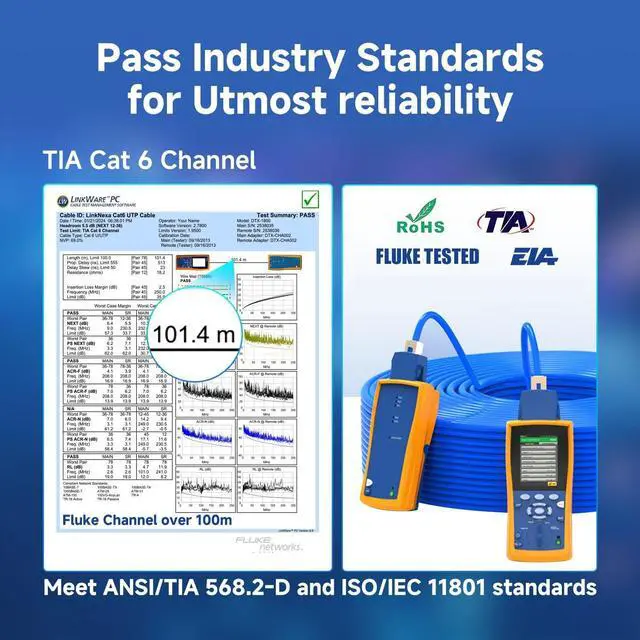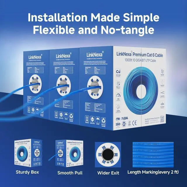 High-Quality Construction for Reliable Network TransmissionCat6 Ethernet cables feature solid 23AWG bare copper construction and an abrasion-resistant PVC jacket, ensuring exceptional transmission capabilities. With support for speeds up to 10G and a bandwidth of 550MHz, perfect for demanding Ethernet networks. ^^ Versatile CompatibilityCat 6 bulk cables, available in 1000ft lengths, are suitable for various applications, including office, residential, and home networks. Fully support Power over Ethernet, compatible with computers, switches, routers, laptops, and more, efficiently delivering both data and power. ^^ Certified and GuaranteedLinkNexa Cat6 Ethernet cables undergo rigorous testing, including the Fluke Channel Test, and comply with ANSI/TIA 568.2 -D and ISO/IEC 11801 standards.