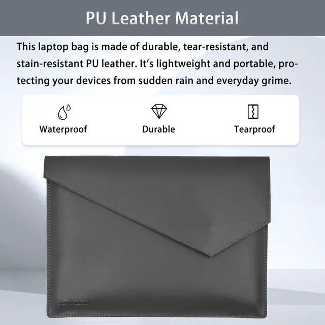 Compatible with multiple modelsInternal dimensions of the 13.3 -inch laptop bag: 302 mm x 215 mm ( 11.88 inches x 8.46 inches). Compatible with MacBook Pro, MacBook Air, Surface Book, Huawei, Dell, Lenovo, ASUS, Acer, HP, and other brands of 13.3 -inch and smaller laptops. Please note that all dimensions are measured manually and may have slight errors. (Please check the dimensions, not just the model number, before purchasing. The most compatible models are listed in the product description. ) ^^ Selected MaterialsThe exterior of this laptop bag is made of durable, tear-resistant, and easy-to-clean PU leather. It has a moderate texture and is lightweight and portable. It reliably protects your internal devices from sudden rain and everyday dirt. The entire interior is lined with a soft, high-density microfiber lining. It won't scratch your laptop's surface and provides all-around cushioning and protection for your valuable equipment, allowing you to use it with peace of mind ^^ Magnetic Snap DesignThis PU leather laptop bag features a unique magnetic Snap design, making opening and closing extremely convenient. The magnetic Snap securely holds your laptop in place when closed, ensuring peace of mind during normal use.