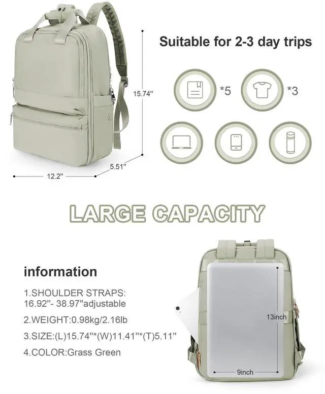Can fit 4 pieces of daily clothes, books, power bank, etc. Suitable for 2-3 day trips. ^^ Multiple PocketsThe laptop travel backpack has 13 pockets (including 1 pen pocket). 1 front compartment, 1 front zippered pocket, 1 main compartment, 1 separate laptop compartment, 2 cup pockets with elastic straps (one of them has a headphone hole), and 1 hidden back pocket. The casual bag makes your items better organized and categorized. ^^ Anti-Theft Carry On BackpackA hidden zippered pocket on the back to store and protect valuables such as cell phones.