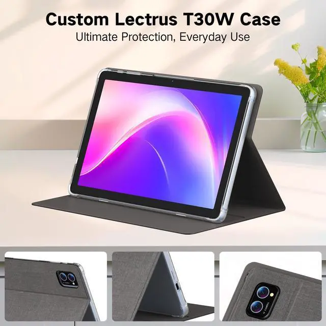 ASIN: B0F18V4ZPK, B0FN6TXBJ5, B0FHGZ2R11, B0F4XLW12X. All cutouts for ports, cameras, and buttons are precision-made for effortless access, ensuring full functionality without ever having to remove the case. ^^ 360 FULL-BODY PROTECTION - Shield your device with all-around defense. This durable PU leather case wraps your Lectrus T30W in a protective shell, safeguarding it from scratches, bumps, dust, and the wear and tear of daily use. The snug fit and soft interior lining keep your tablet secure and scratch-free. ^^ CONVENIENT FOLDABLE STAND - Go hands-free anytime, anywhere. The flexible front cover easily folds into a stable stand for watching movies, attending video calls, or following recipes. Enjoy a perfect viewing angle on your desk, kitchen counter, or any flat surface. ^^ LIGHTWEIGHT & PREMIUM PU LEATHER - Don't add bulk, just add protection. Despite its rugged protection, this case remains surprisingly lightweight and comfortable to hold. The high-quality PU leather offers a professional look that is scratch-resistant and easy to clean. ^^ SECURE, SNUG-FIT DESIGN - Engineered for a perfect hold.