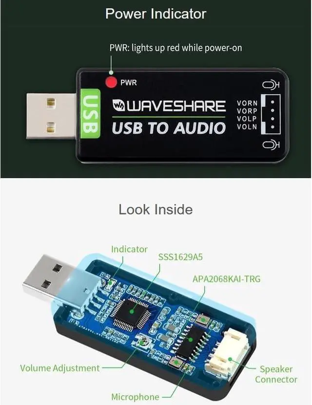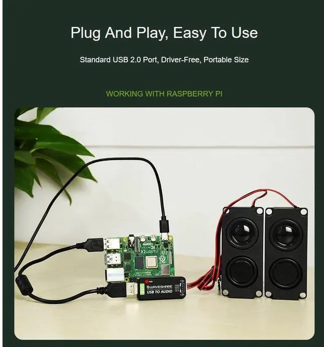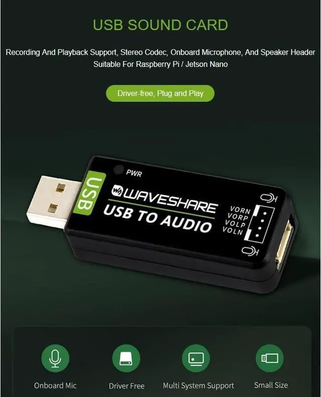 This is a USB sound card/USB audio module with 8 5W Speaker that supports recording and playback, a stereo codec, a built-in microphone, and a speaker. It is suitable for Raspberry Pi/Jetson Nano, driver-free, plug-and-play ^^ "Listening / Speaking" Two-In-One-- onboard microphone, and speaker header, easy audio input / output. Plug and Play, easy to use--standard USB 2.0 port, driver-free, portable size ^^ Multiple sampling rates support--supported sampling rates including 8K, 11.025K, 12K, 16K, 22.05K, 24K, 32K, 44.1K, and default 48K (Hz) ^^ Support Multiple systems--Compatible with mac/Win7/8/ 8.1 /10, Linux, Android, WinCE ^^ Comes with