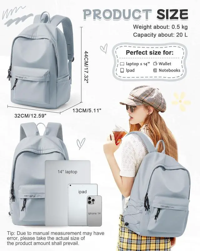 Weight: 1.1LB / 0.5KG. If you are looking for a small and stylish backpack, this is your ideal choice. The bag uses a 14-inch laptop compartment design, and there is more space to store daily necessities, clothes, shoes, books, mobile phones, wallets, etc.