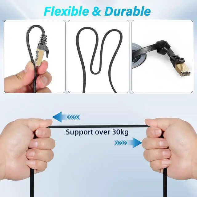 Ultra-thin flat design (thickness: 0.11 - 0.13 inches, width: 0.32 - 0.45 inches, depending on length). Flexible and ultra-thin for easy storage, helping you manage cables quickly and neatly, reducing tangles and knots while improving installation efficiency. 100% pure copper conductors ensure durability and effective noise elimination, meeting RoHS standards. Gold-plated RJ45 connectors enhance shielding, resist oxidation and corrosion, and ensure stable transmission. Supports 600 MHz bandwidth and up to 10 Gbps speeds for gaming, 4K streaming, and large downloads with no lag. Compatible with a wide range of devices, including Wi-Fi routers, gaming consoles (PS4/PS5, Xbox), computers, network media players, and servers. Fully backward compatible with Cat6, Cat5e, and Cat5 cables. Whether setting up a home office, gaming setup, or data center, these cables provide reliable connectivity for all your devices.