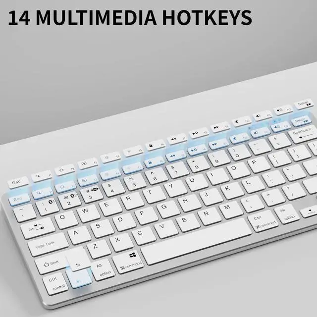 Wireless keyboard: 78 key compact layout, lightweight and convenient, suitable for office use. 12 multimedia shortcut keys provide quick access to the most widely used functions, such as play pause, volume up and down, email
