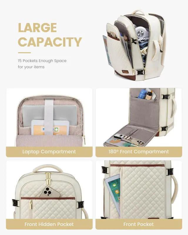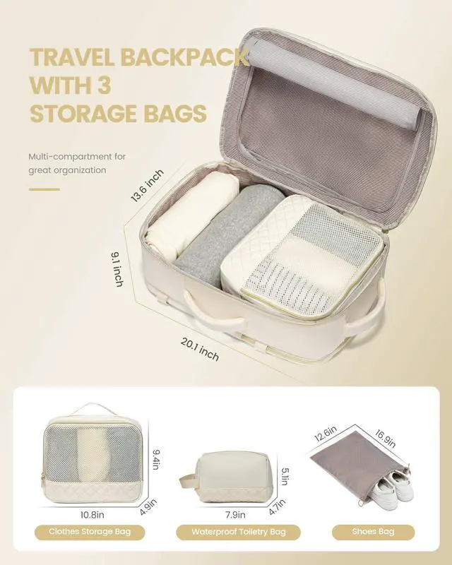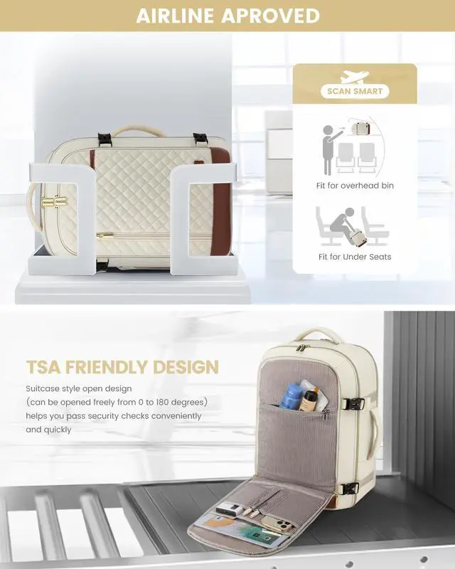 AIRLINE APPROVED TRAVEL BAG The size of the carry-on backpack is 13.6 * 9.1 * 20.1 inches. Meets the maximum size allowed by most International Air Transport Association (IATA) flights, and can be placed in the overhead luggage compartment and under seat luggage for airlines, suitable for Spirit, Frontier, Easy Jet, Jet Blue, and other airlines. ^^ DESIGN LIKE SUITCASE Say goodbye to awkward packing and disorganized luggage. This backpack boasts multiple compartments, interior pockets, and compression straps to keep your clothes, shoes, electronics, and travel essentials neatly organized and secure during your journey.